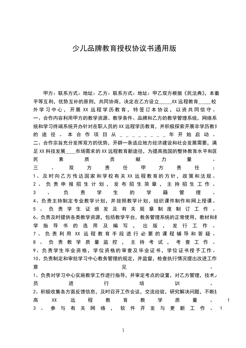 甲方:联系方式:地址:乙方:联系方式:地址:甲乙双方根据《民法典》,本着平等互利,优势互补的原则,共同协商,决定在乙方设立_____XX远程教育_____校外学习中心,开展XX远程学历教育,特签订本协议,以资共同信守。