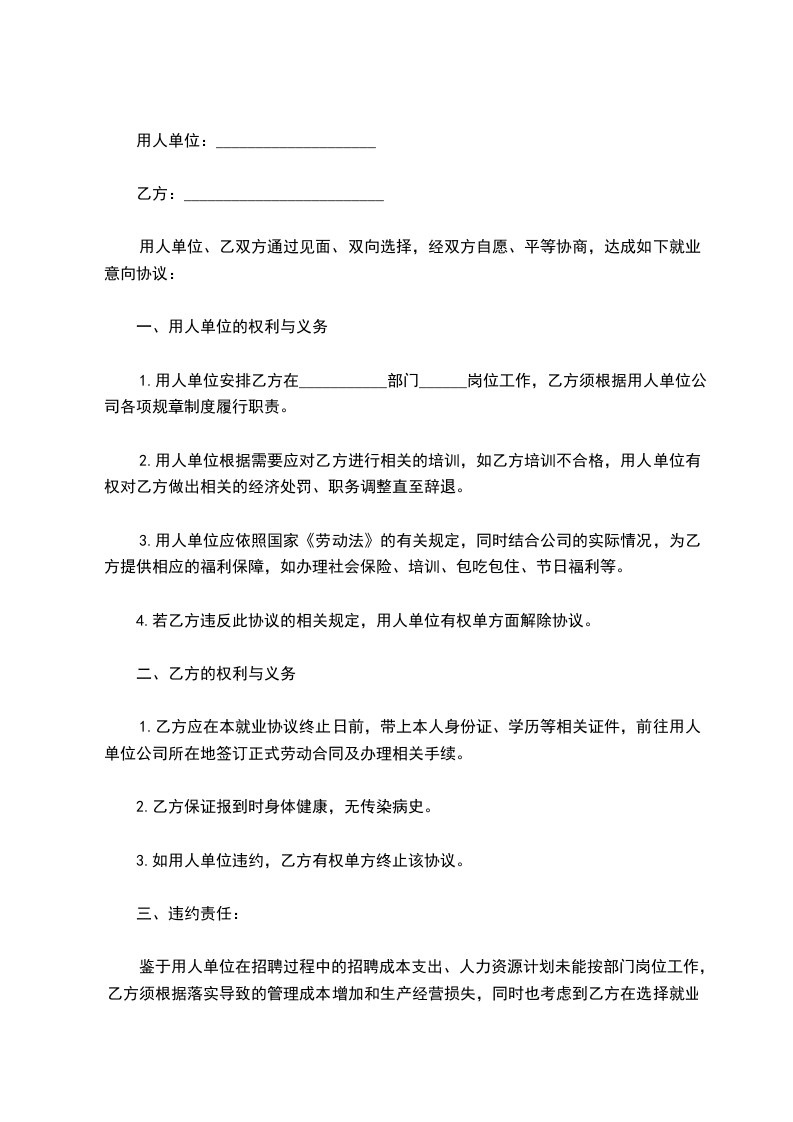 用人单位、乙双方通过见面、双向选择,经双方自愿、平等协商,达成如下就业意向协议:
