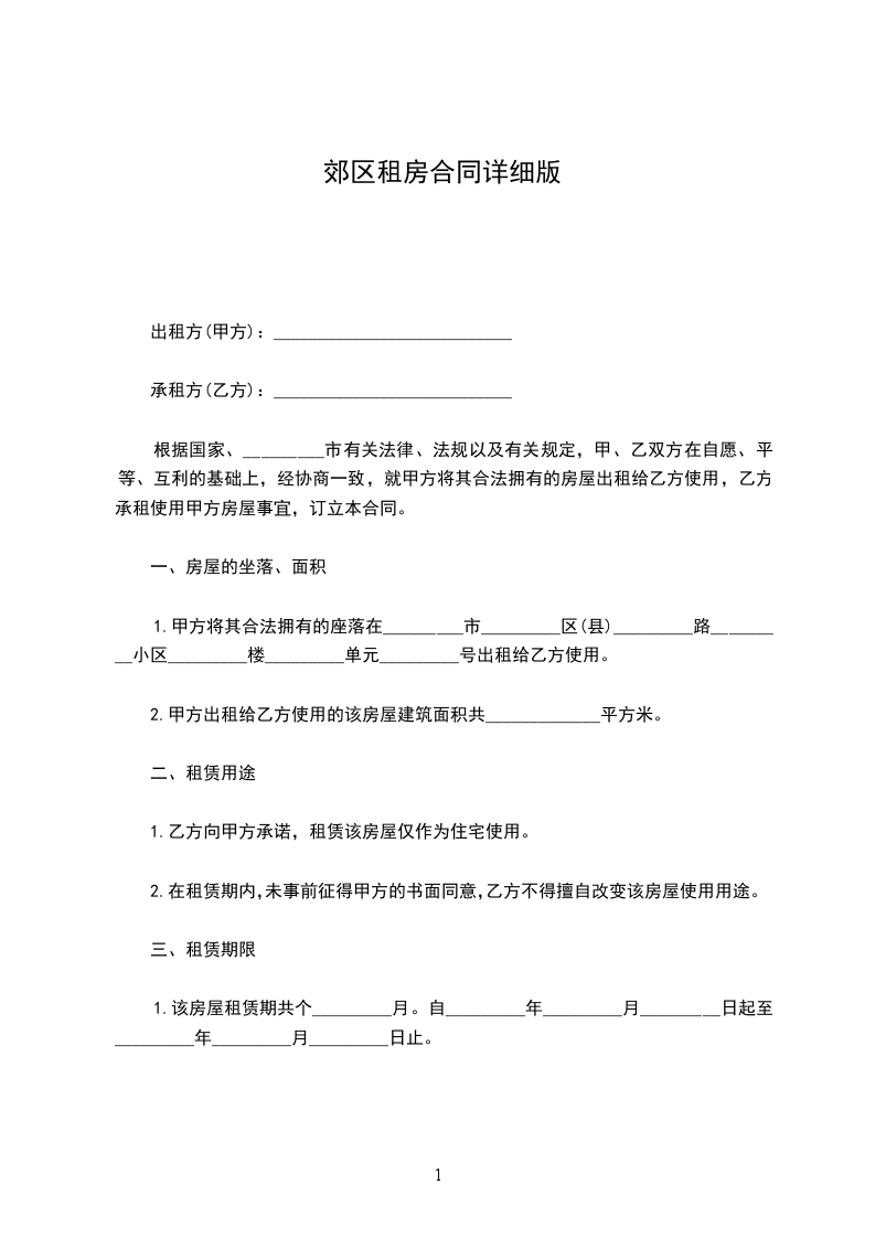 1.甲方将其合法拥有的座落在_________市_________区(县)_________路_________小区_________楼_________单元_________号出租给乙方使用。