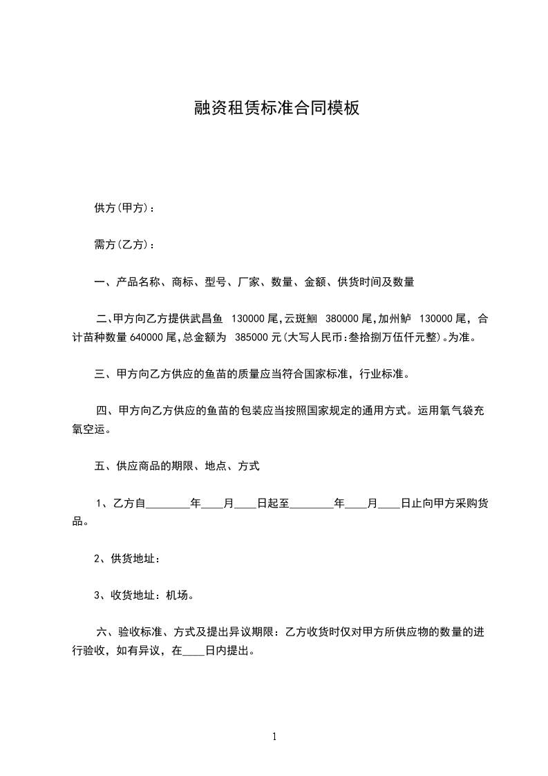 二、甲方向乙方提供武昌鱼130000尾,云斑鮰380000尾,加州鲈130000尾,合计苗种数量640000尾,总金额为385000元(大写人民币:叁拾捌万伍仟元整)。为准。