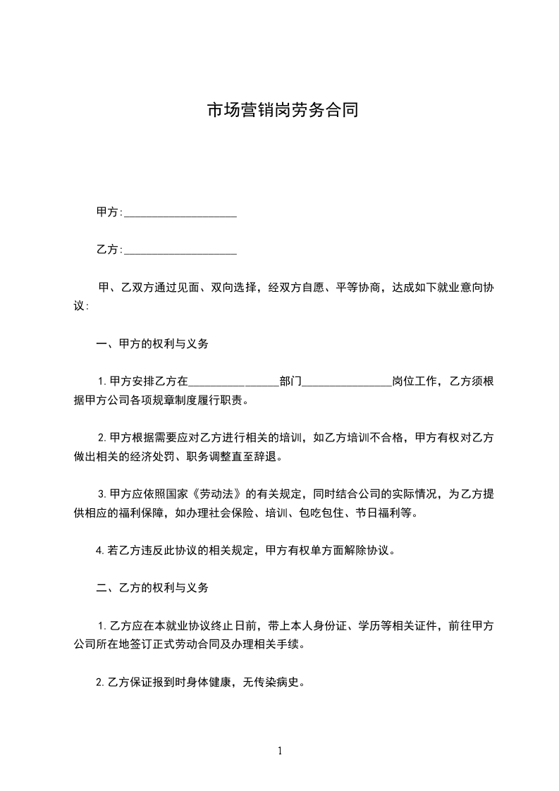 甲、乙双方通过见面、双向选择,经双方自愿、平等协商,达成如下就业意向协议: