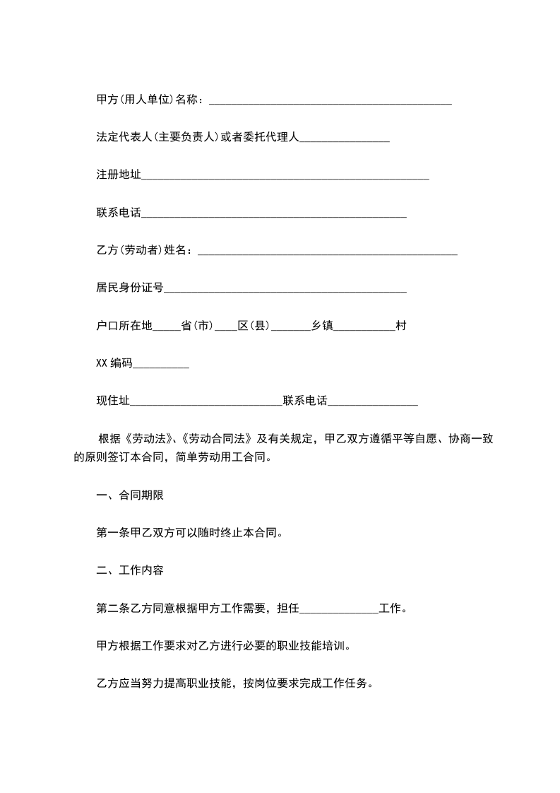 根据《劳动法》、《劳动合同法》及有关规定,甲乙双方遵循平等自愿、协商一致的原则签订本合同,简单劳动用工合同。