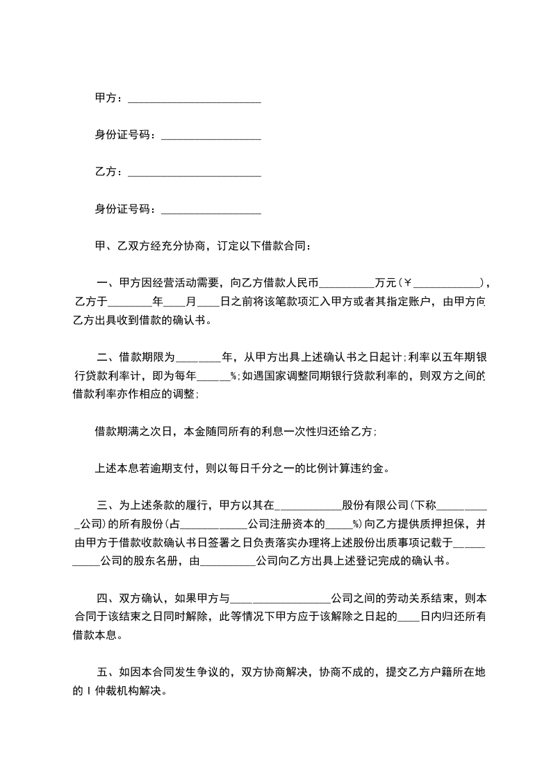 四、双方确认,如果甲方与__________________公司之间的劳动关系结束,则本合同于该结束之日同时解除,此等情况下甲方应于该解除之日起的____日内归还所有借款本息。