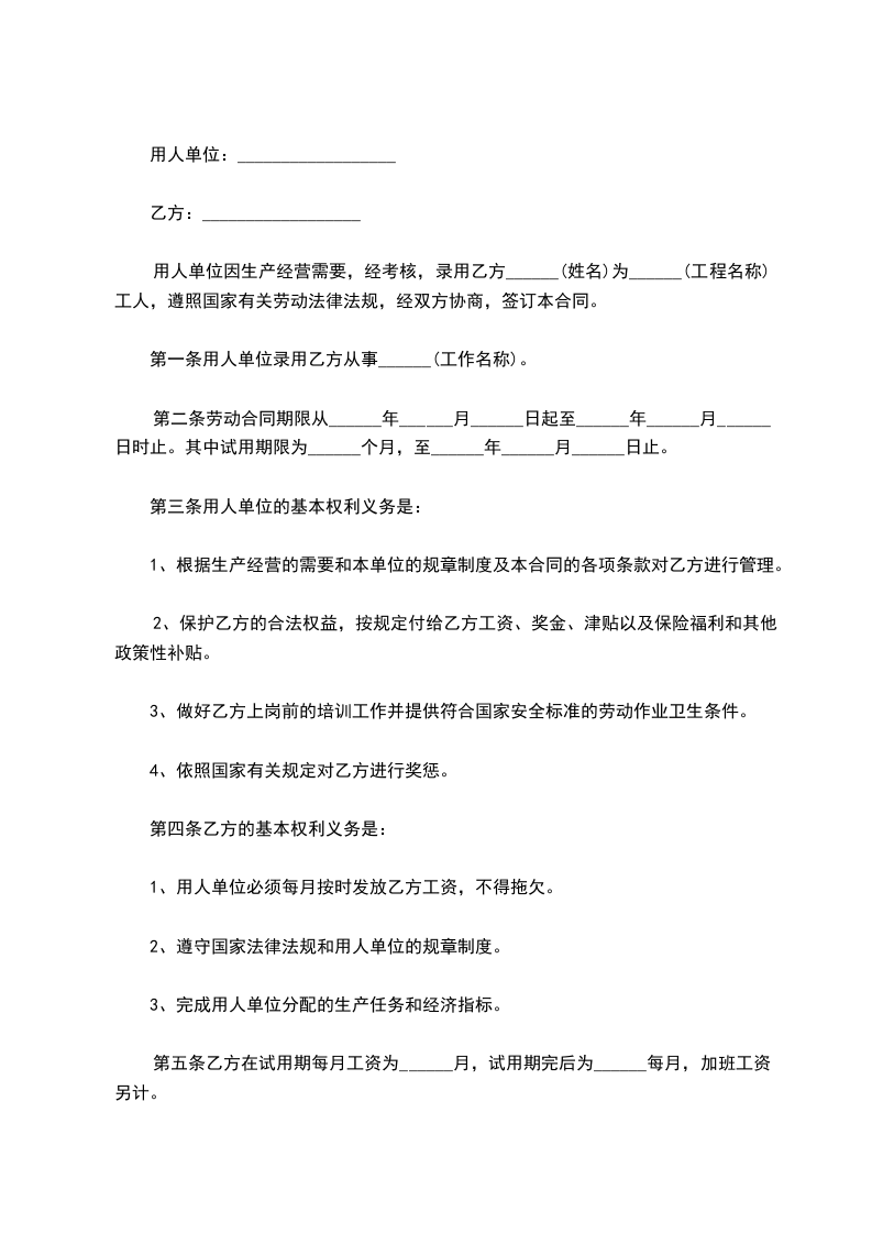 用人单位因生产经营需要,经考核,录用乙方______(姓名)为______(工程名称)工人,遵照国家有关劳动法律法规,经双方协商,签订本合同。