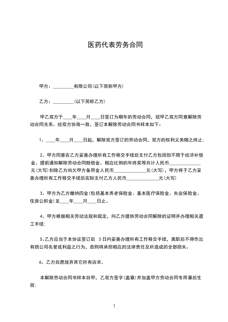 1、____年____月____日起,解除双方签订的劳动合同,双方的权利义务随之终止;