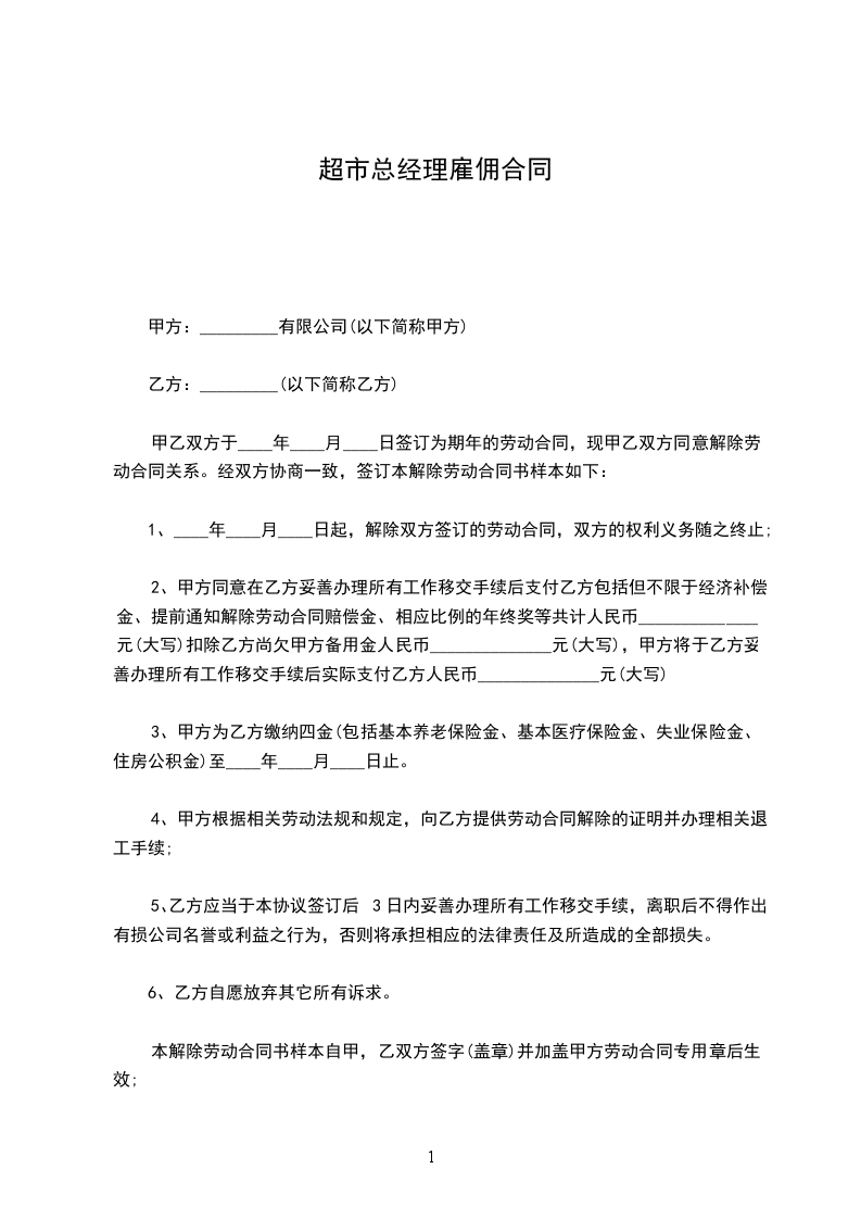 1、____年____月____日起,解除双方签订的劳动合同,双方的权利义务随之终止;