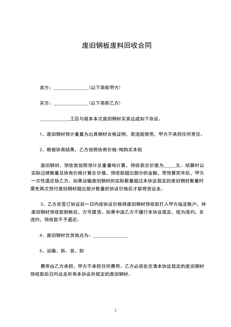 五、本协议期内如遇到不可抗力以致协议不能履行时,甲乙双方互不承担任何责任最新废旧物资回收合同范本最新废旧物资回收合同范本。