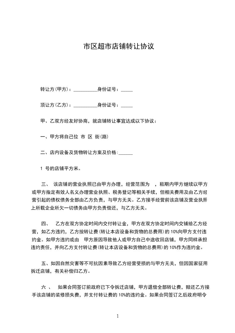 第八条如果合同签订前政府已下令拆迁店铺,甲方退偿全部转让费,赔还装修损失__________元,并支付转让费的__________的违约金。如果合同签订之后政府明令拆迁店铺,或者市政建设(如修,扩路,建天桥,立交桥,修地铁等)导致乙方难以经营,乙方有权解除合同,甲方退还剩余租期的转让费,押金仍归乙方(前述顺延除外)。或甲方在每年营业执照有效期届满时仍未办妥年审手续,乙方有权解除合同,甲方应退回全部转让费,赔偿装修,添置设备损失__________元,并支付转让费的__________的违约金。