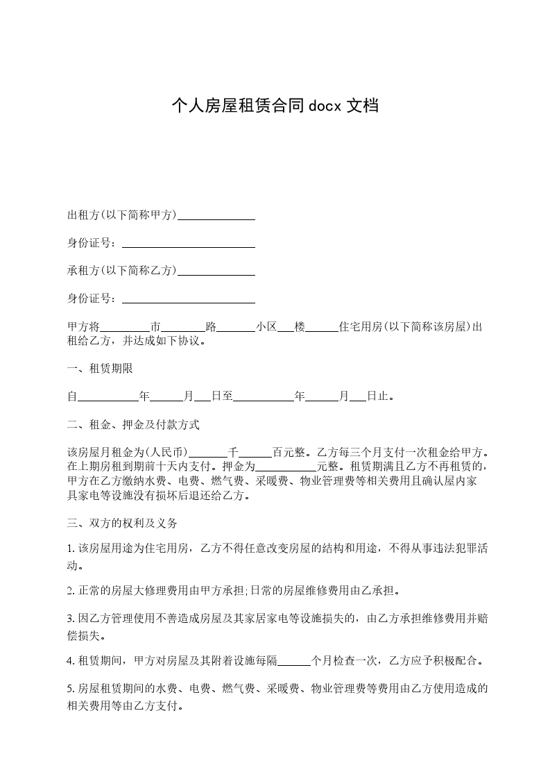 4、房屋只限乙方使用,乙方不得私自转租、改变使用性质或供非法用途。租下本房后,乙方应立即办好租赁登记、暂住人口登记等手续。若发生非法事件,乙方自负后果。