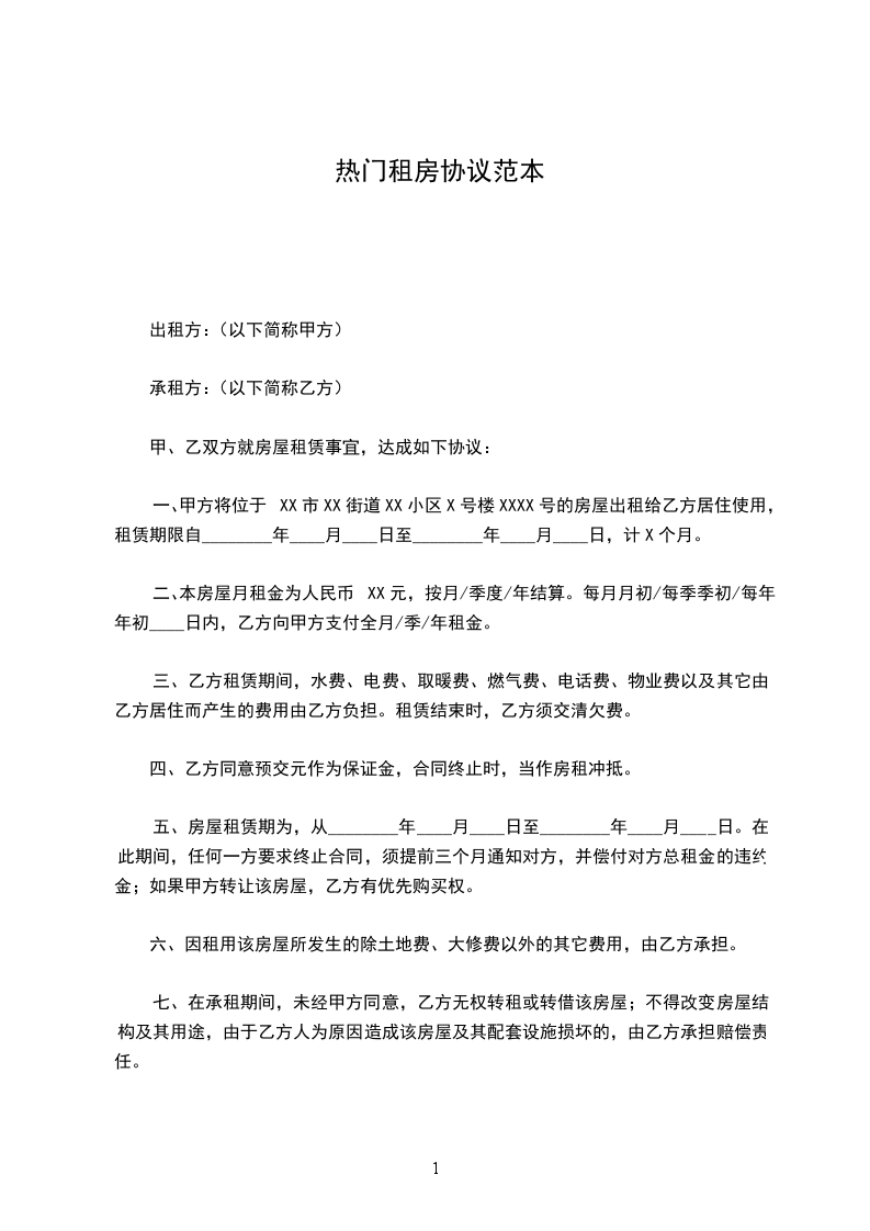 一、甲方将位于XX市XX街道XX小区X号楼XXXX号的房屋出租给乙方居住使用,租赁期限自________年____月____日至________年____月____日,计X个月。