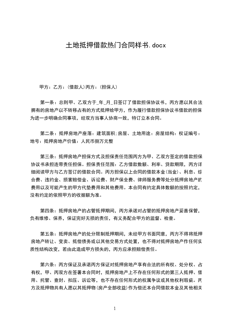 兹因土地抵押借款事宜,经双方同意订立各条款如下: