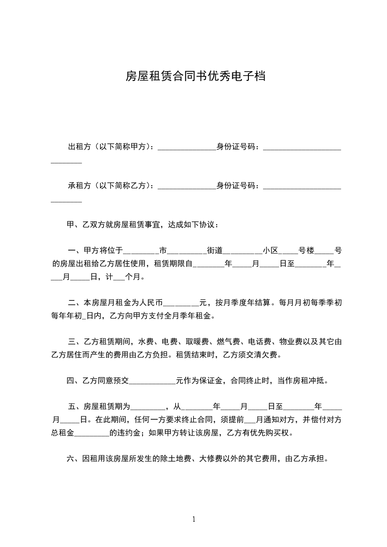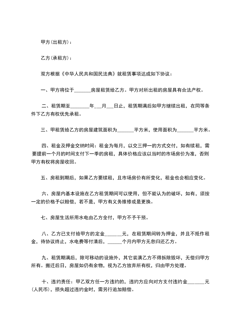 四、租金及押金交纳时间:租金为每月,以交三押一的方式交付,如有续租,需要提前一个月的时间支付下一季的房租,具体价格应该以当时的市场房价为准,否则,甲方有权将房屋收回。