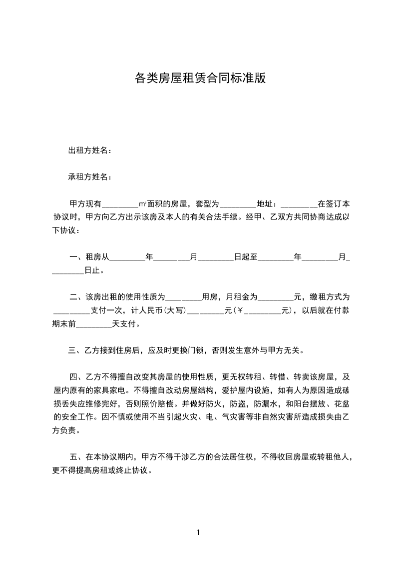 二、该房出租的使用性质为_________用房,月租金为_________元,缴租方式为_________支付一次,计人民币(大写)_________元(¥_________元),以后就在付款期末前_________天支付。