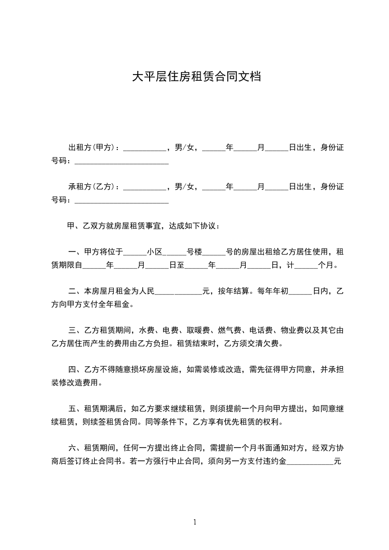 一、甲方将位于______小区______号楼______号的房屋出租给乙方居住使用,租赁期限自______年______月______日至______年______月______日,计______个月。