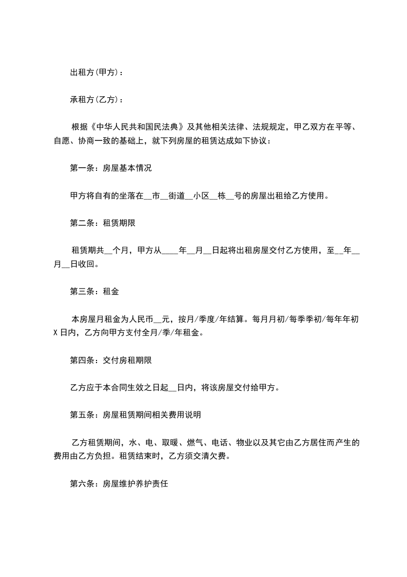根据《中华人民共和国民法典》及其他相关法律、法规规定,甲乙双方在平等、自愿、协商一致的基础上,就下列房屋的租赁达成如下协议: