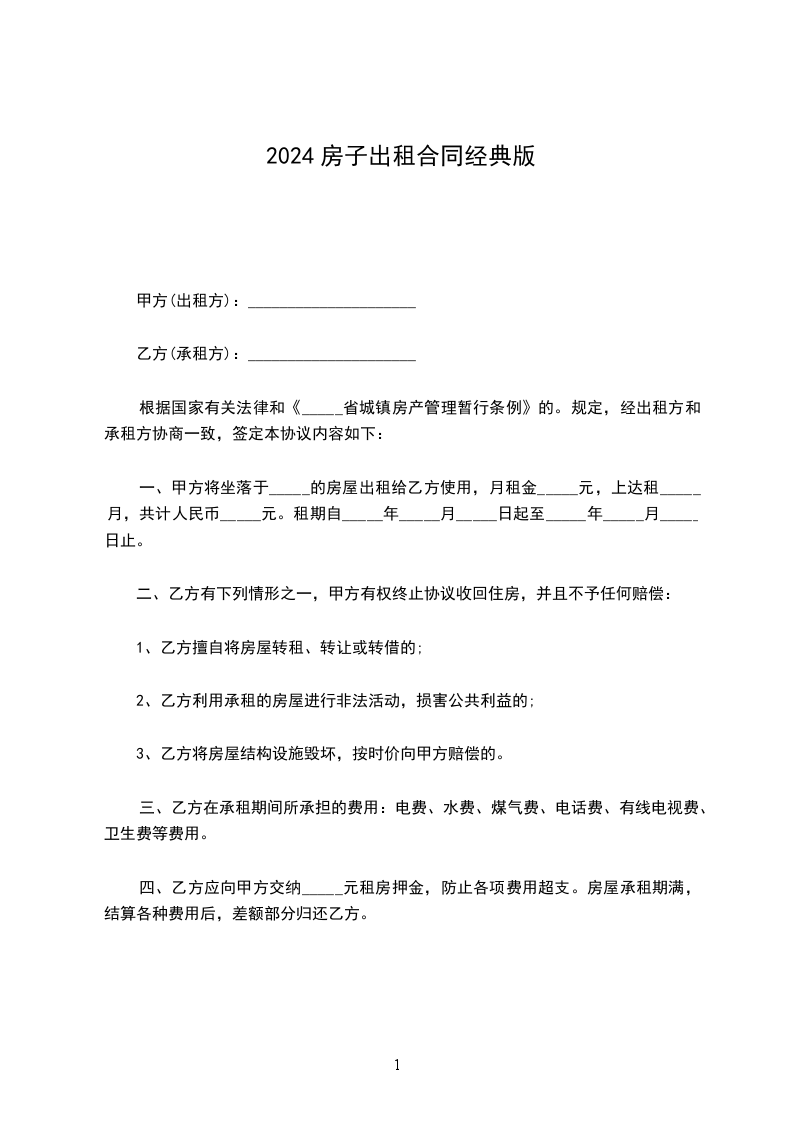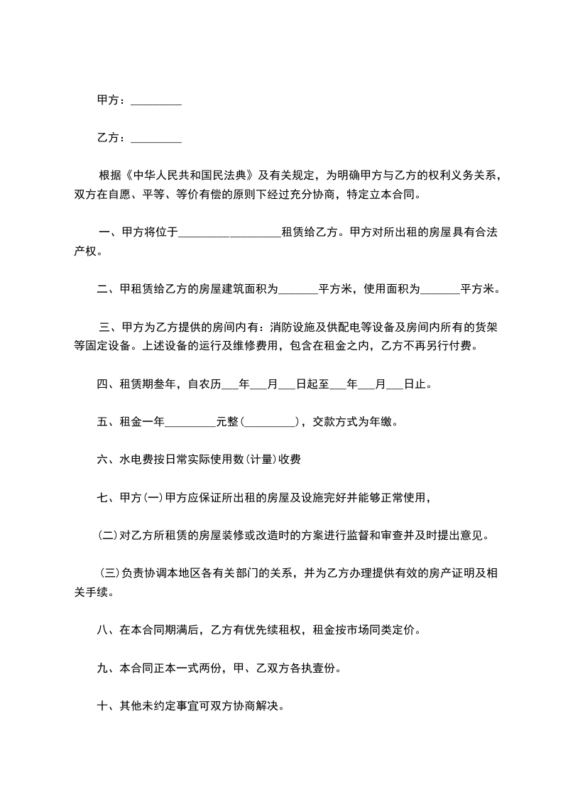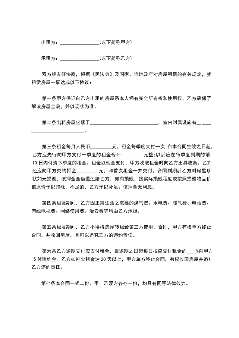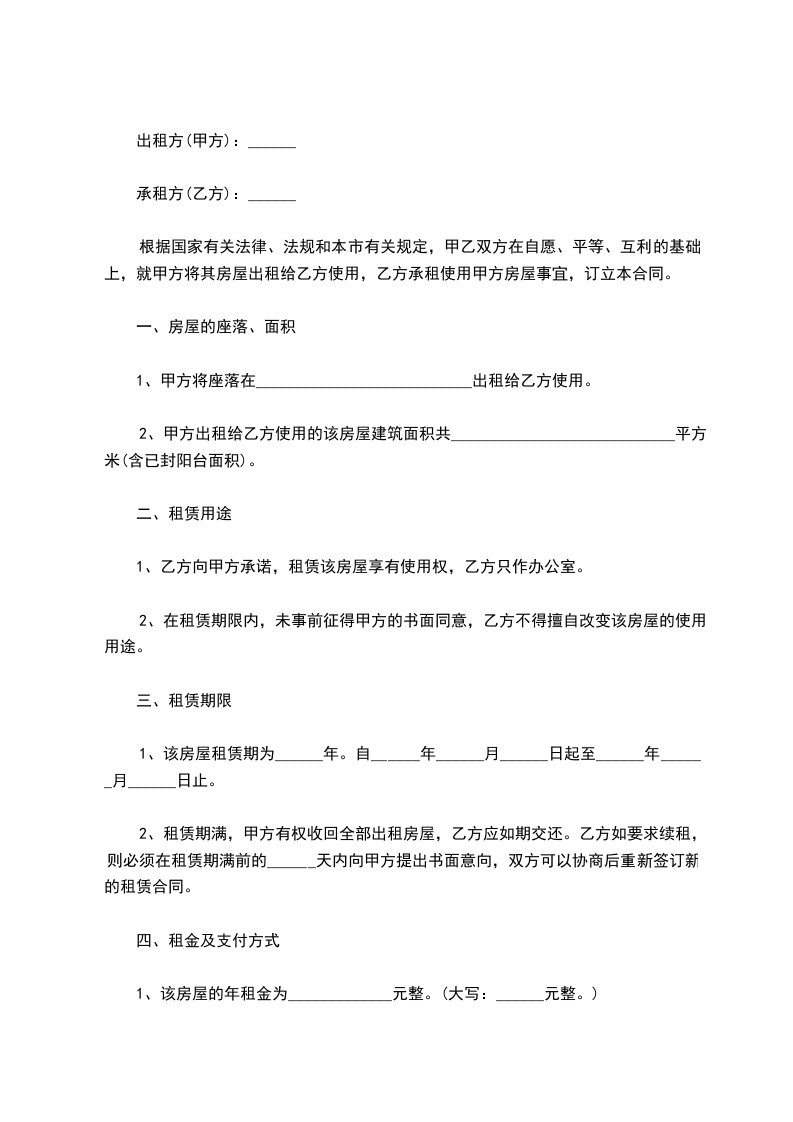 五、租金一年_________元整(_________),交款方式为年缴。