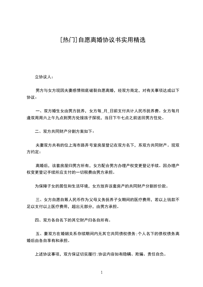 五、其他协议事项:________上述协议事项,双方保证切实履行;协议内容如有隐瞒、欺骗、责任自负。本协议一式三份,当事人双方各执一份,交婚姻登记机关存档备案一份。立协议人: