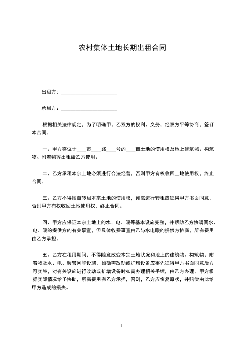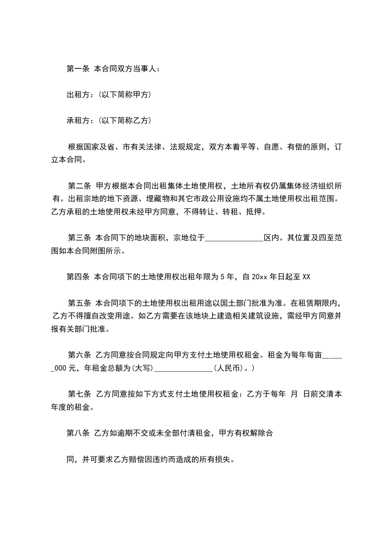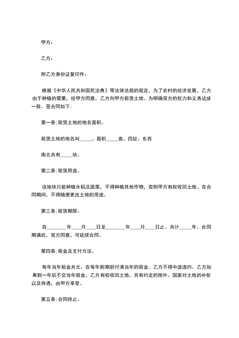 根据【中华人民共和国农村土地租赁法】等法律法规的规定,为了农村的经济发展,乙方由于种植的需要,经甲方同意,乙方向甲方租赁土地。为明确双方的权力和义务达成一致。签合同如下;