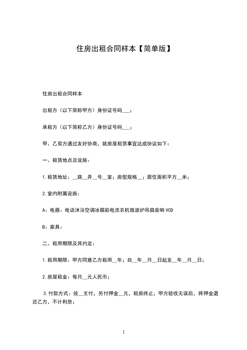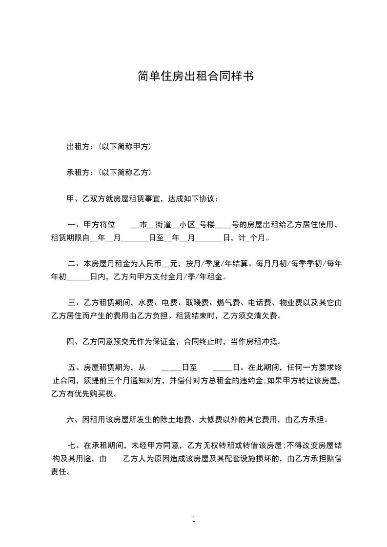 一、甲方将位于____市____街道___小区___号楼号的房屋出租给乙方居住使用,租赁期限自______年___月___日至____年___月___日,计___个月。