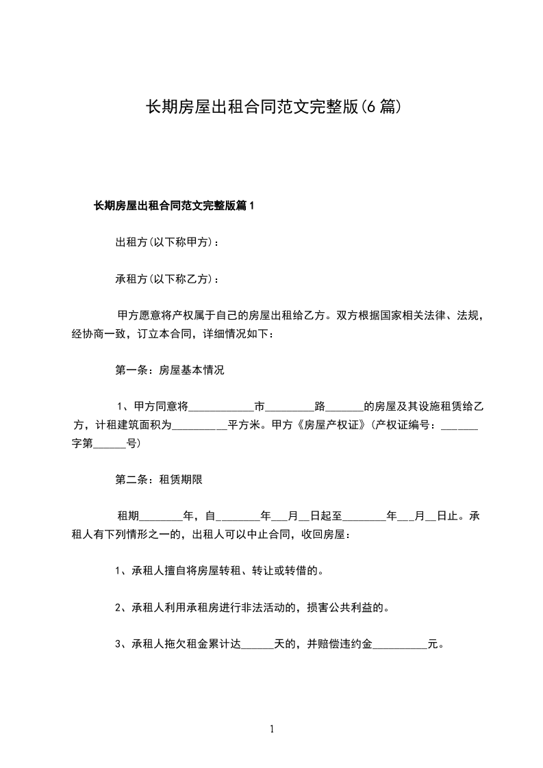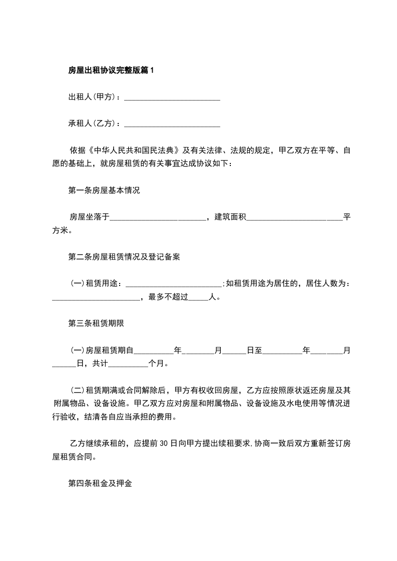 房屋出租合同完整版篇1