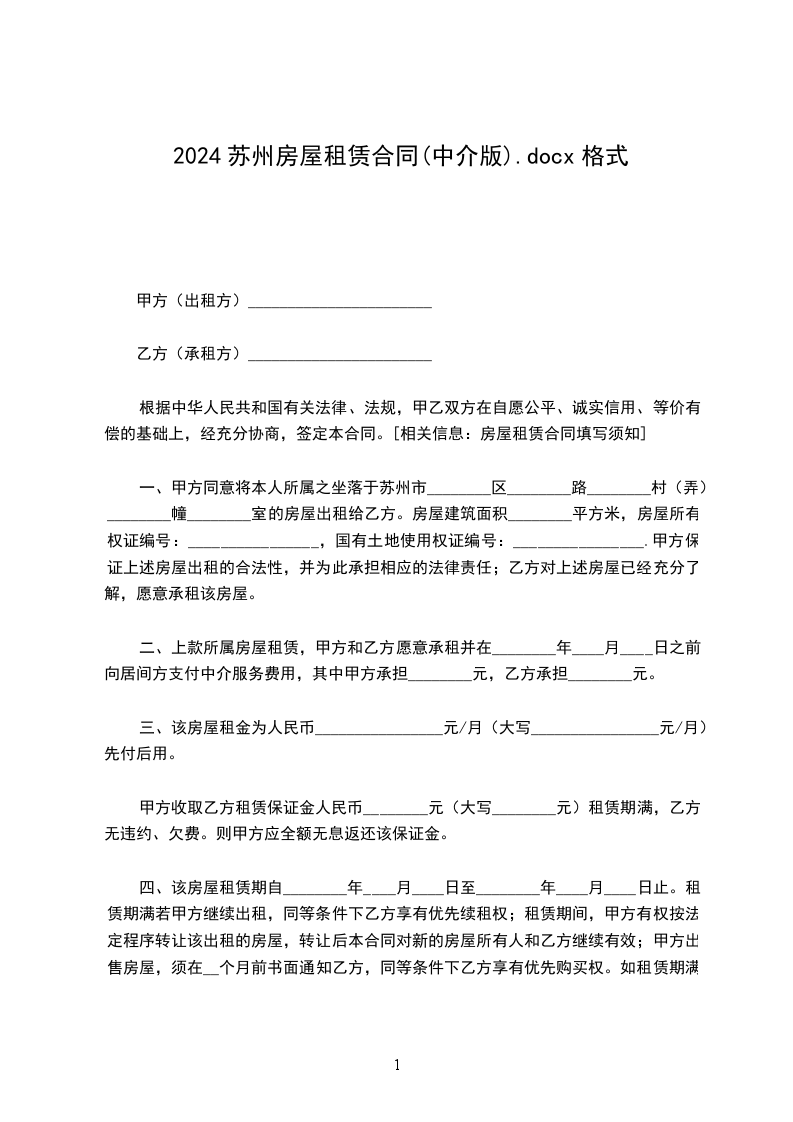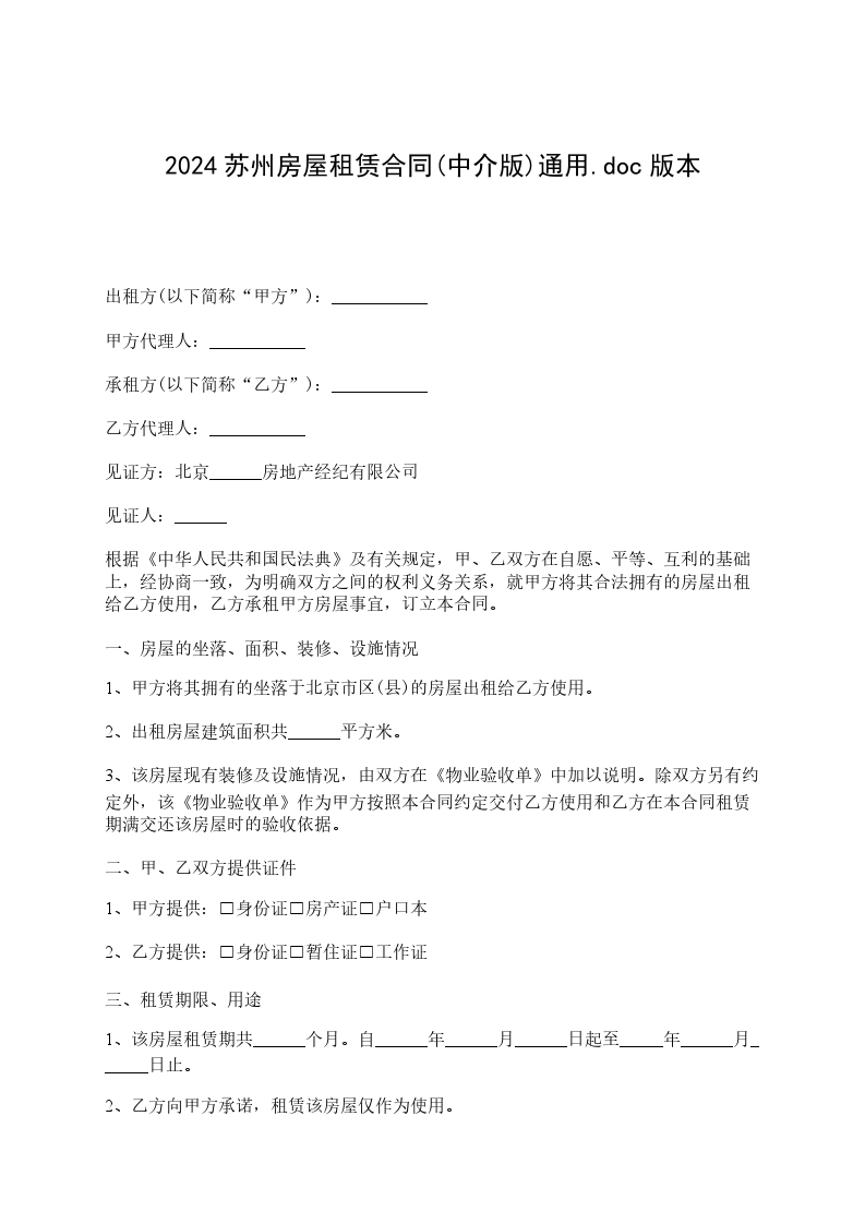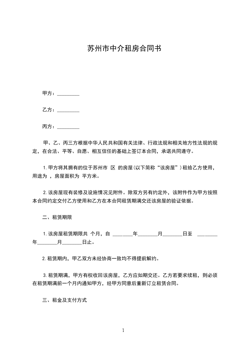 苏州房屋租赁合同(中介通用版)