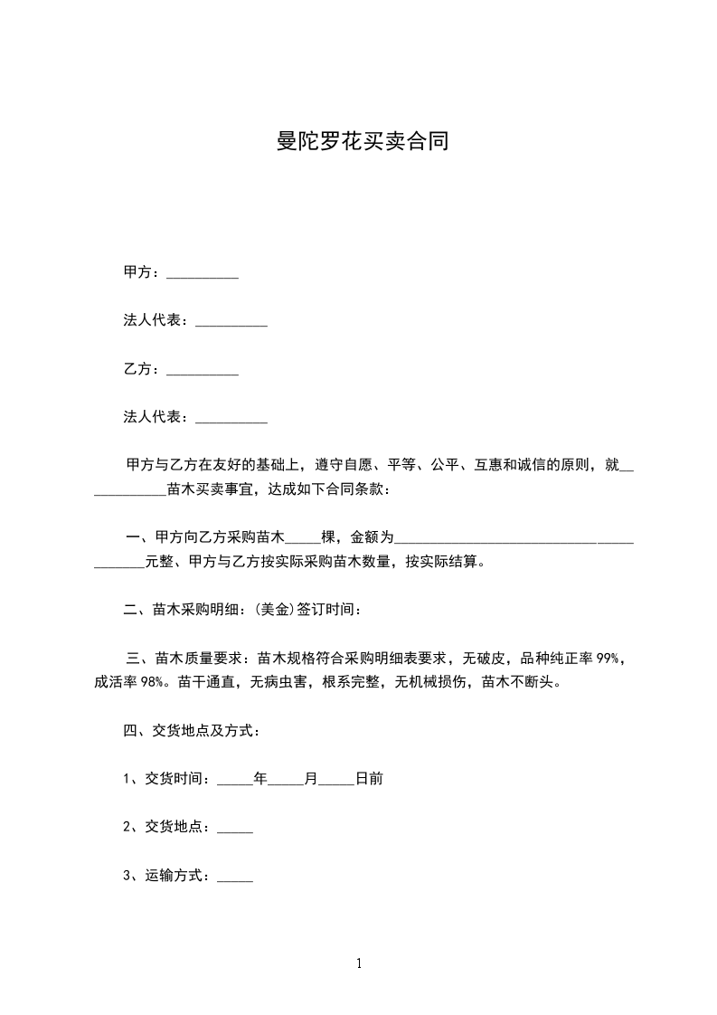 一、根据乙方的需要,甲方组织保质保量的货源,由乙方在场地内自由选购发育正常的树苗,达到乙方满意。乙方购买______________(______________)株,______________(______________)株。(_____________________每株______________元,______________每株______________元)树苗共计_____________________元整。
