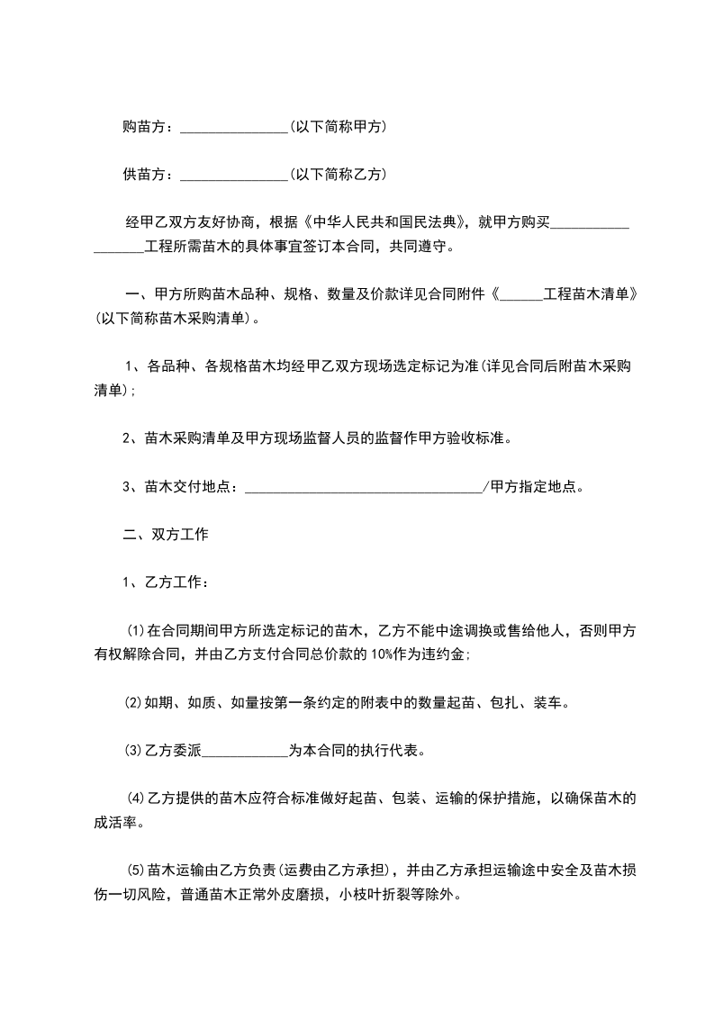 一、甲方向乙方采购苗木株,金额为人民币。甲方与乙方按实际采购苗木数量,按实结算。