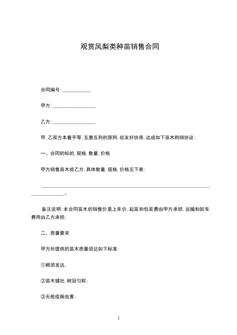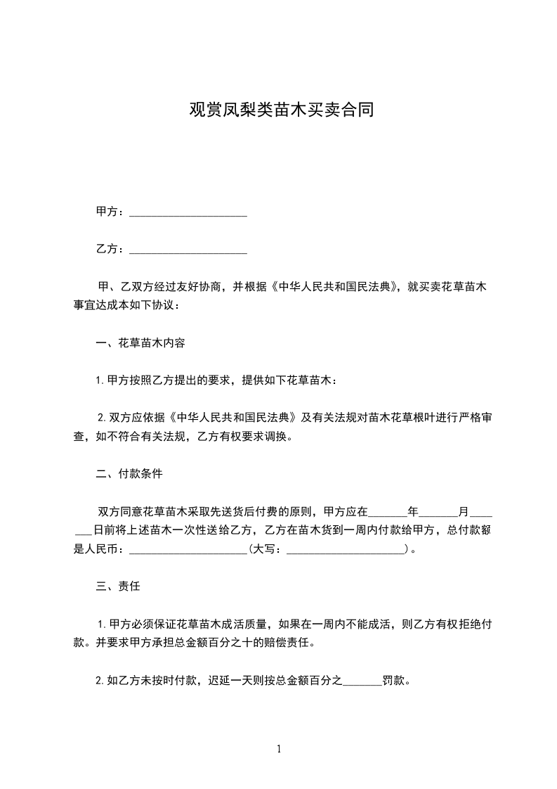 一、根据乙方的需要,甲方组织保质保量的货源,由乙方在场地内自由选购发育正常的树苗,达到乙方满意。乙方购买______________(______________)株,______________(______________)株。(_____________________每株______________元,______________每株______________元)树苗共计_____________________元整。