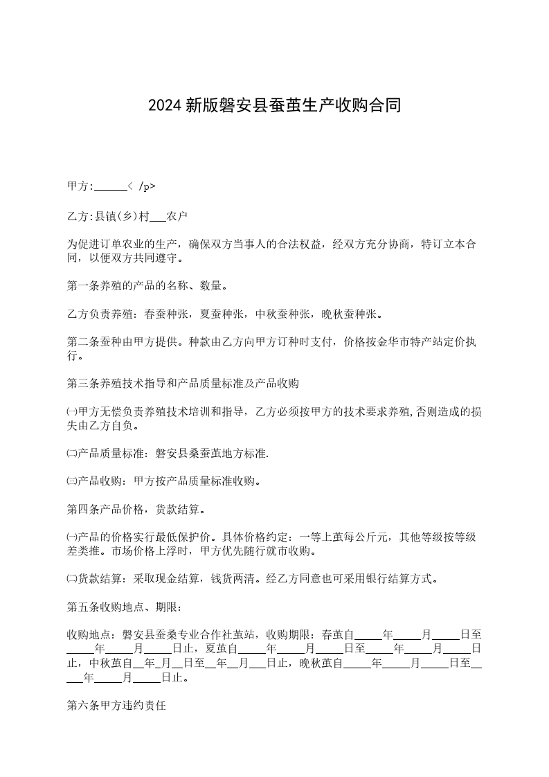 收购地点:磐安县蚕桑专业合作社茧站,收购期限:春茧自_____年_____月_____日至_____年_____月_____日止,夏茧自_____年_____月_____日至_____年_____月_____日止,中秋茧自__年_月__日至__年__月___日止,晚秋茧自_____年_____月_____日至_____年_____月_____日止。