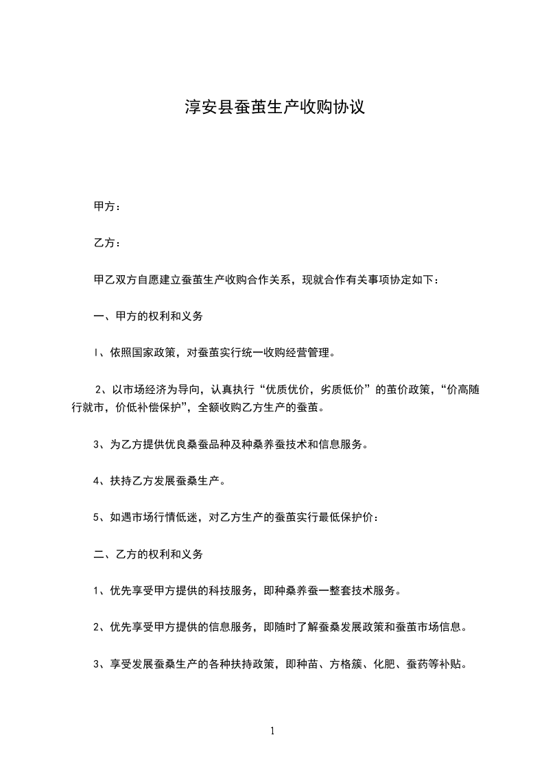 ㈠产品的价格实行最低保护价。具体价格约定:一等上茧每公斤元,其他等级按等级差类推。市场价格上浮时,甲方优先随行就市收购。