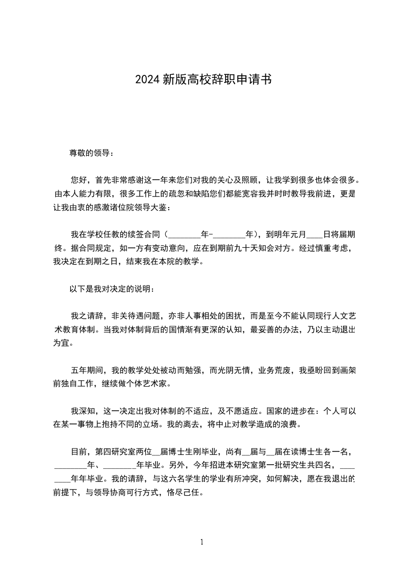 我在学校任教的续签合同(________年-________年),到明年元月____日将届期终。据合同规定,如一方有变动意向,应在到期前九十天知会对方。经过慎重考虑,我决定在到期之日,结束我在本院的教学。