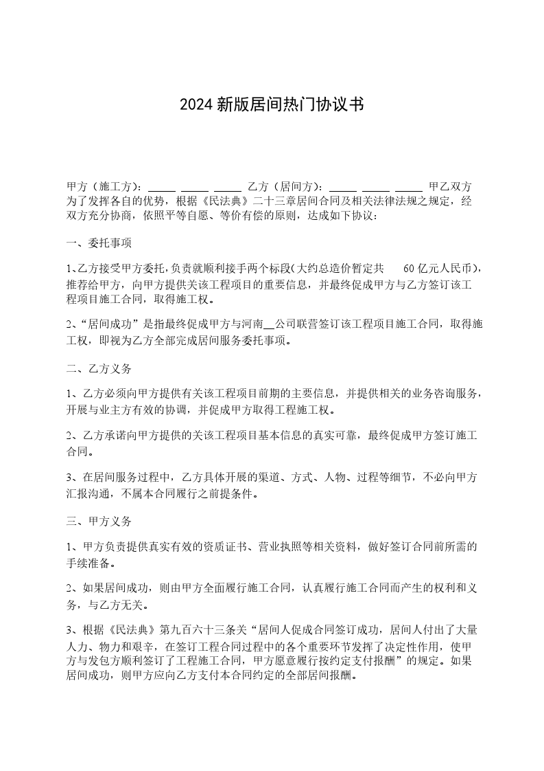 甲方(施工方):_____ _____ _____ 乙方(居间方):_____ _____ _____ 甲乙双方为了发挥各自的优势,根据《民法典》二十三章居间合同及相关法律法规之规定,经双方充分协商,依照平等自愿、等价有偿的原则,达成如下协议:
