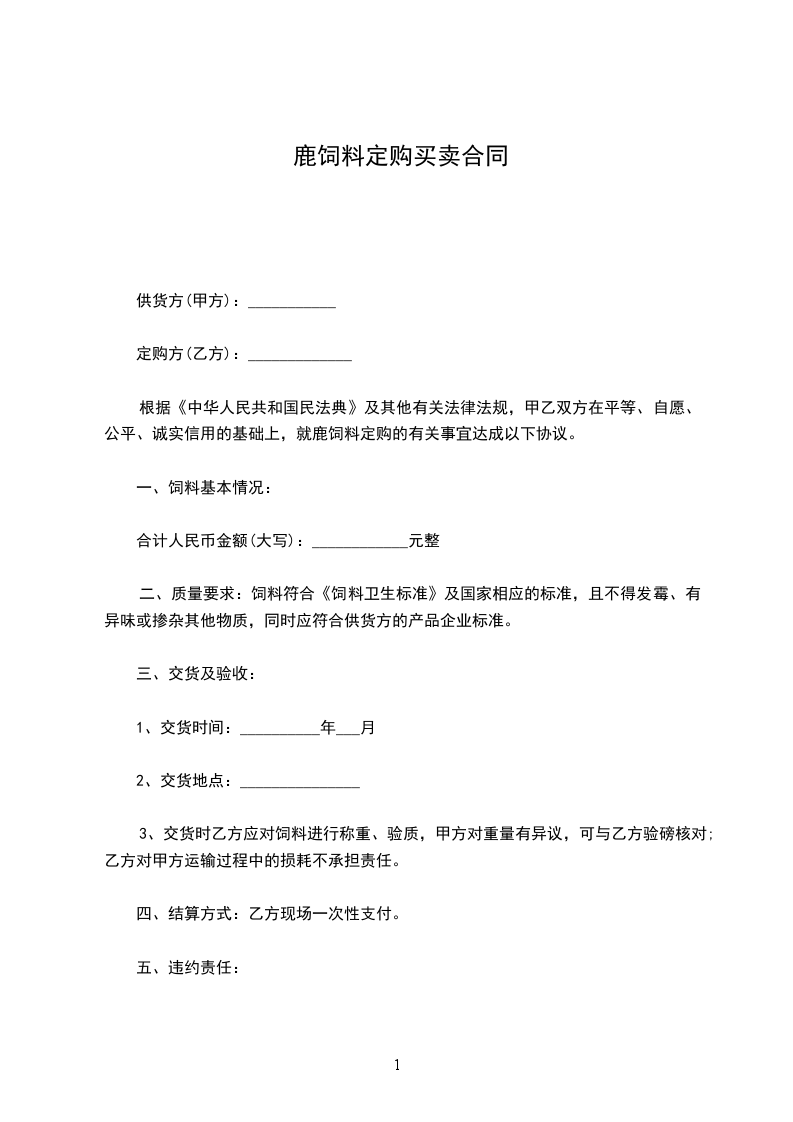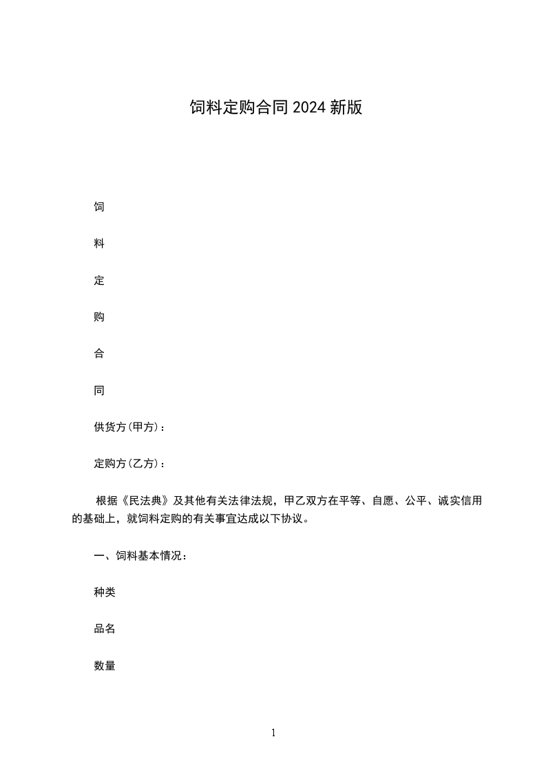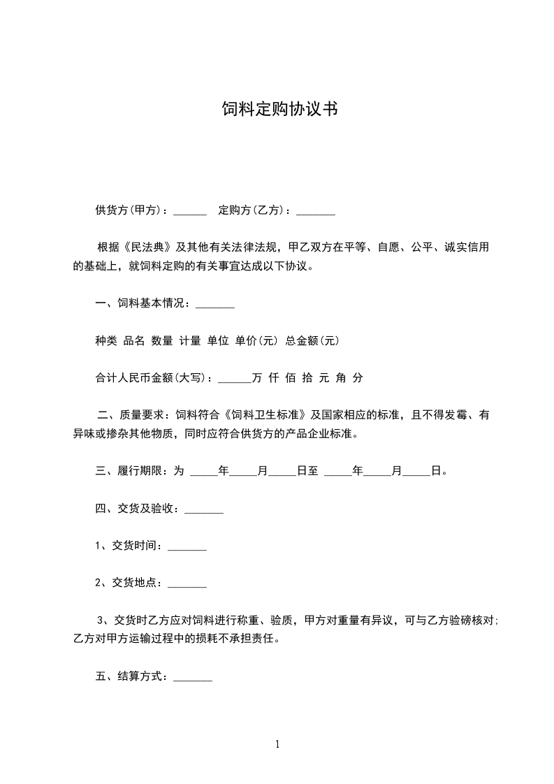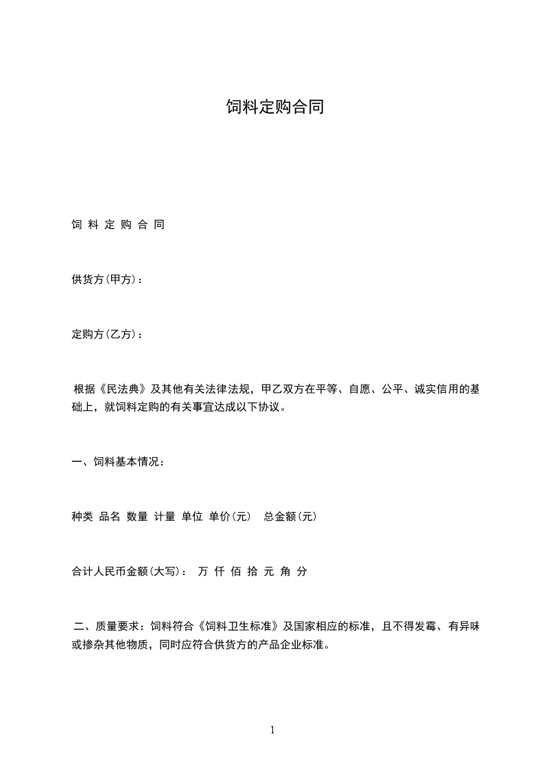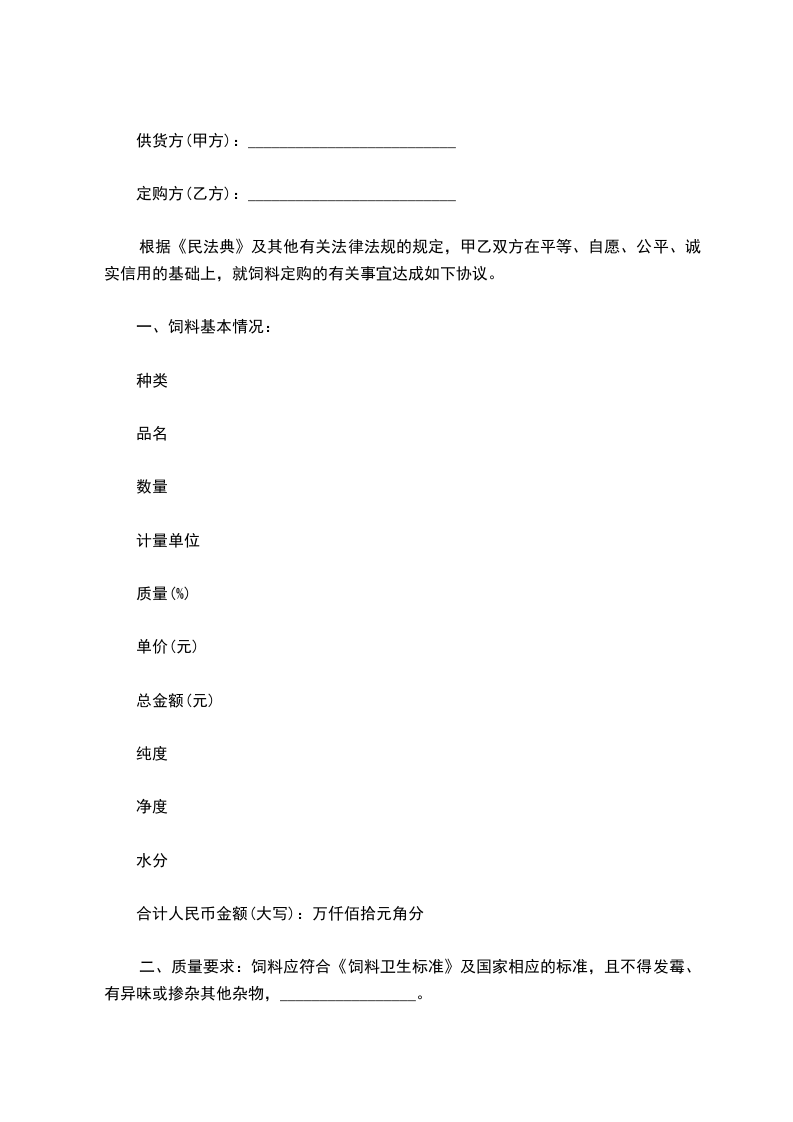 根据《民法典》及其他有关法律法规,甲乙双方在平等、自愿、公平、诚实信用的基础上,就饲料定购的有关事宜达成以下协议。