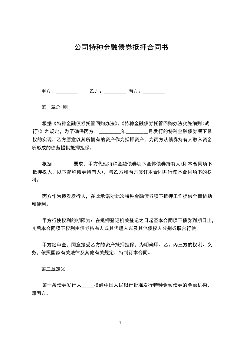 根据《特种金融债券托管回购办法》、《特种金融债券托管回购办法实施细则(试行)》之规定,为了确保丙方于_________年_________月发行的特种金融债券项下债权的实现,乙方愿意以其所拥有的资产作为抵押资产,为丙方从债券持有人融入资金所形成的债务提供抵押担保。