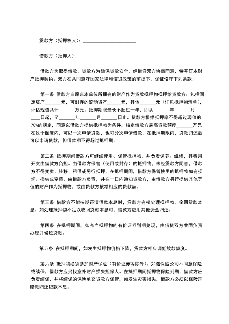 第一条 借款方自愿以本单位所拥有的财产作为贷款抵押物抵押给贷款方:包括固定资产_______元,可封存的流动资产______元,其他_______元(详见抵押物清单),评估现值共计_______万元。抵押期限最长不超过一年,即从_______年_______月_______日起,至_______年_______月_______日止。贷款方根据抵押率不得超过现值的70%的规定,同意以借款方提供抵押物为条件,核定借款方最高贷款额度_______万元。在这个额度内,可以一次申请贷款,也可分次申请借款,在抵押期限内,贷款归还后可以申请贷款,但借款期不得超过抵押期。