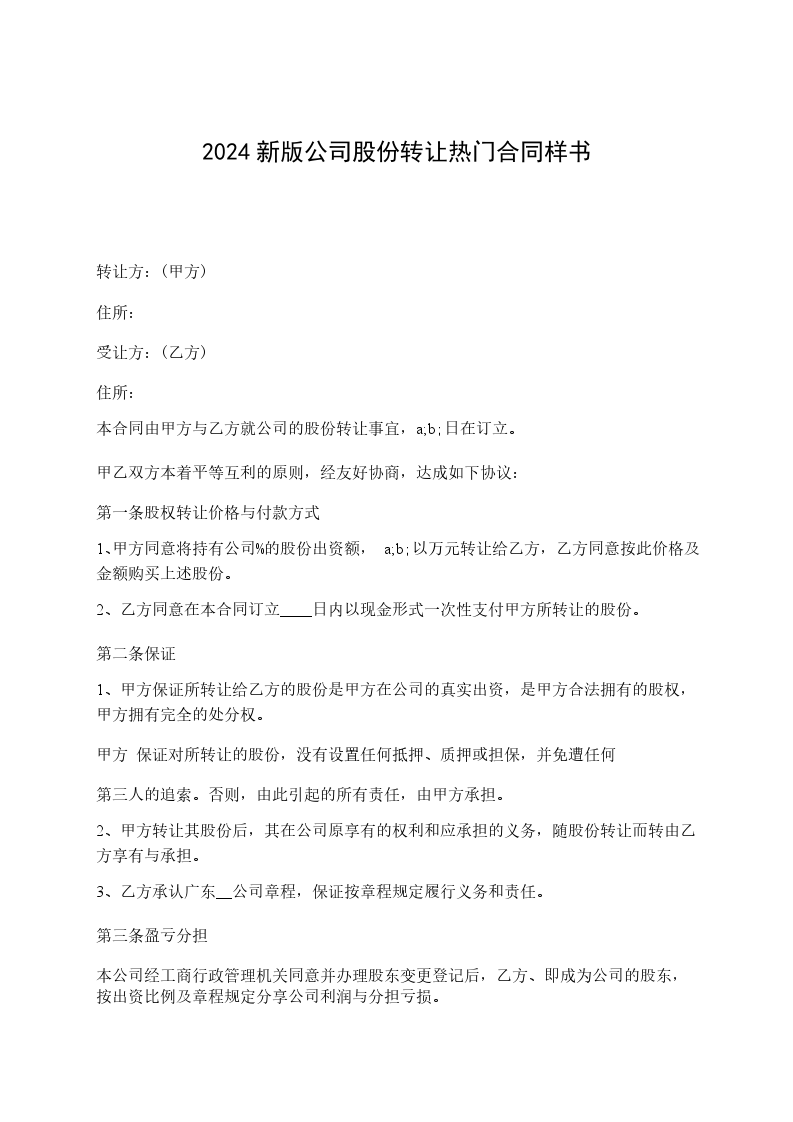1、甲方同意将持有公司%的股份出资额,a;b;以万元转让给乙方,乙方同意按此价格及金额购买上述股份。