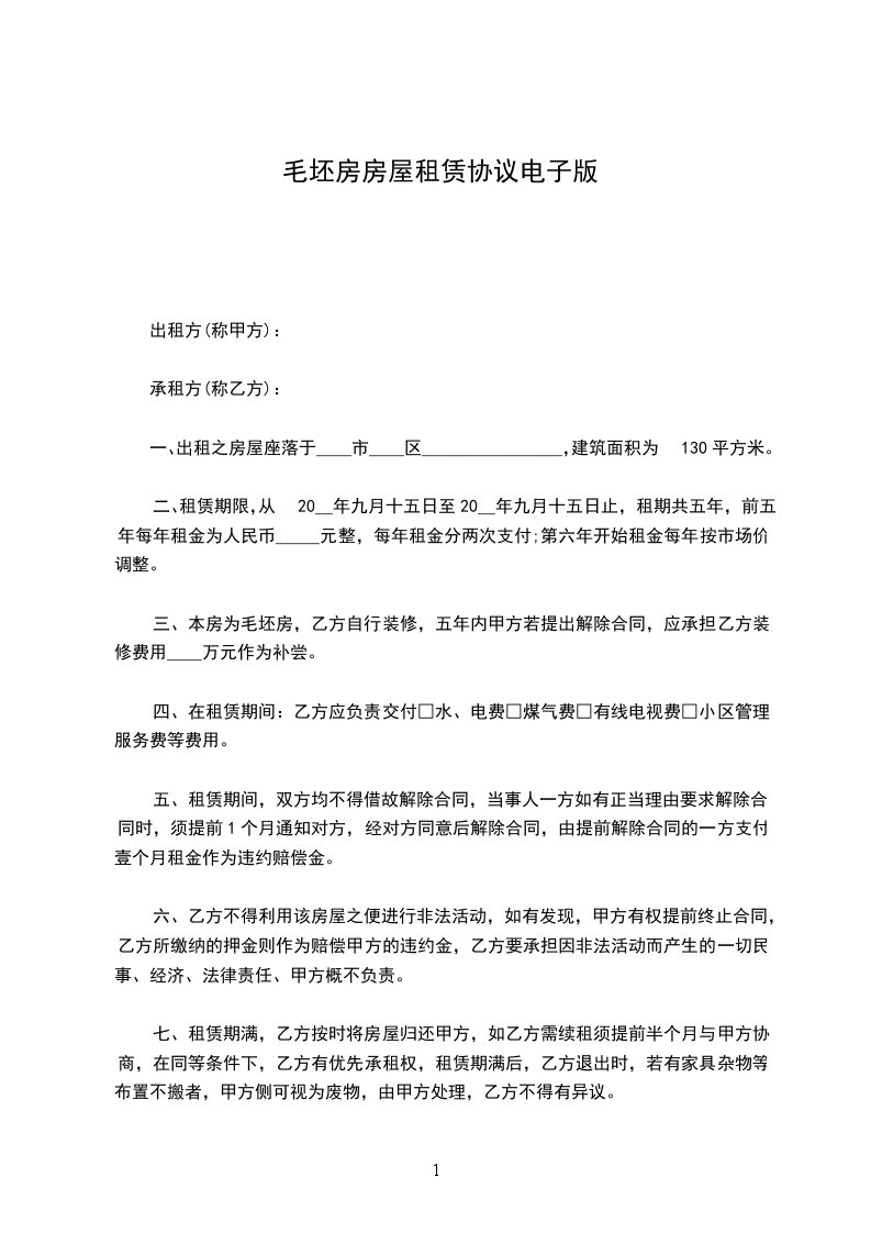 三、本房为毛坯房,乙方自行装修,五年内甲方若提出解除合同,应承担乙方装修费用____万元作为补尝。
