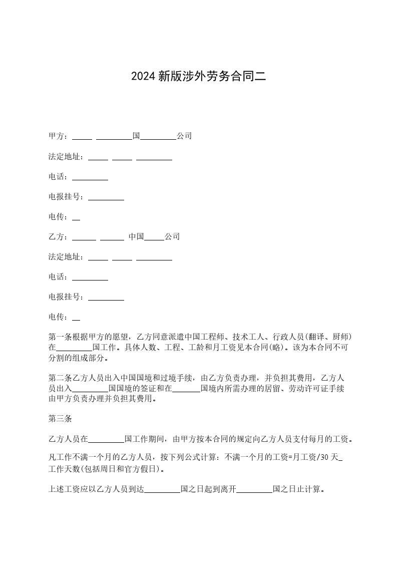 第一条根据甲方的愿望,乙方同意派遣中国工程师、技术工人、行政人员(翻译、厨师)在_________国工作。具体人数、工程、工龄和月工资见本合同(略)。该为本合同不可分割的组成部分。