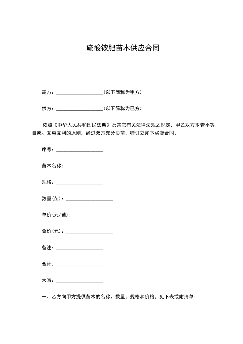 一、甲方向乙方采购苗木_______株,金额为人民币________。甲方与乙方按实际采购苗木数量,按实结算。