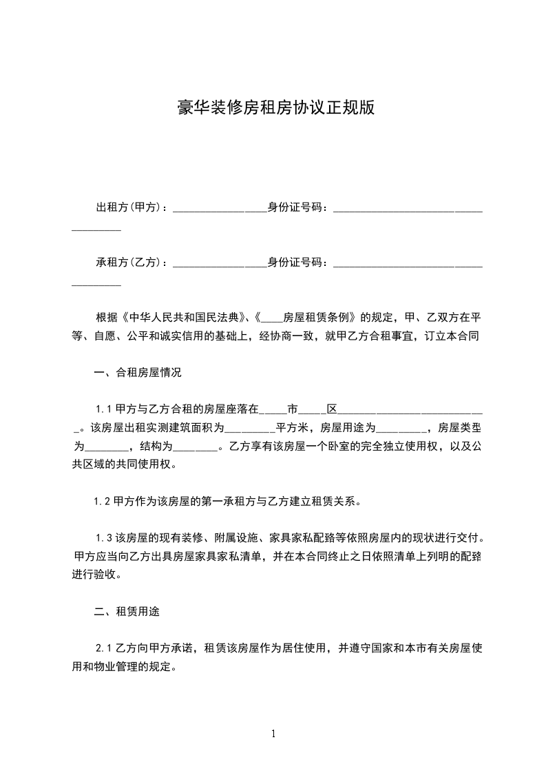 1.1甲方与乙方合租的房屋座落在_____市_____区___________________________。该房屋出租实测建筑面积为_________平方米,房屋用途为_________,房屋类型为________,结构为________。乙方享有该房屋一个卧室的完全独立使用权,以及公共区域的共同使用权。