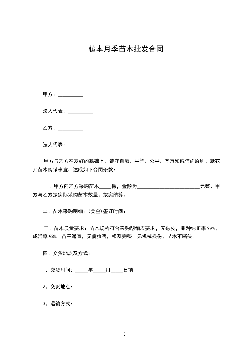 一、甲方向乙方采购苗木_____棵,金额为_________________________元整、甲方与乙方按实际采购苗木数量,按实结算。