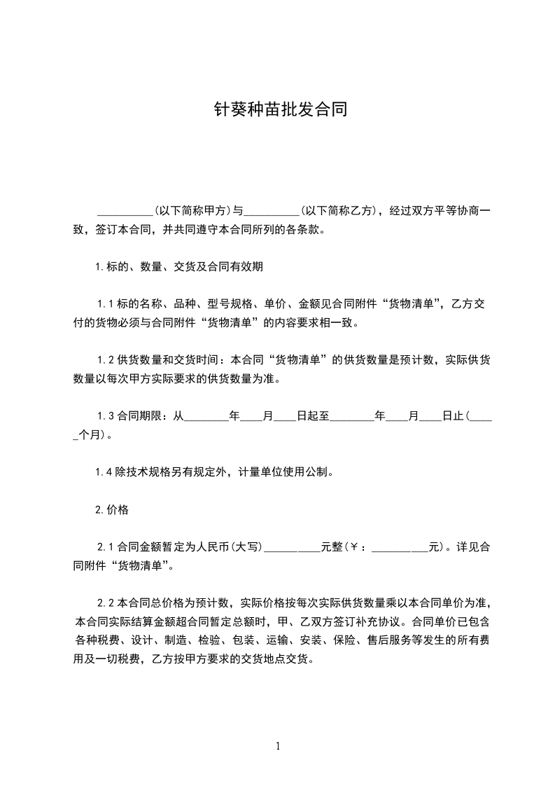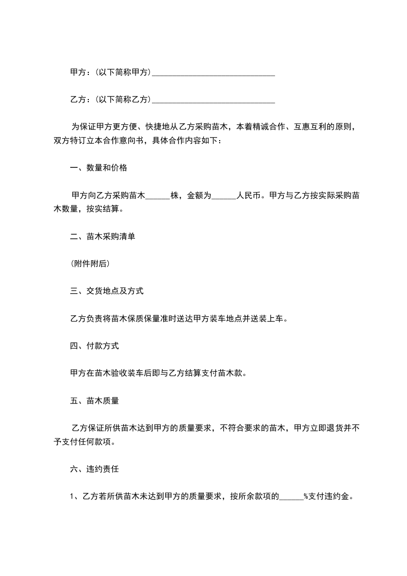 1.购销苗木品种、数量、价格、提货时间