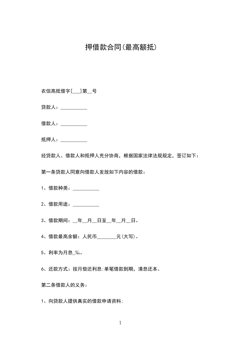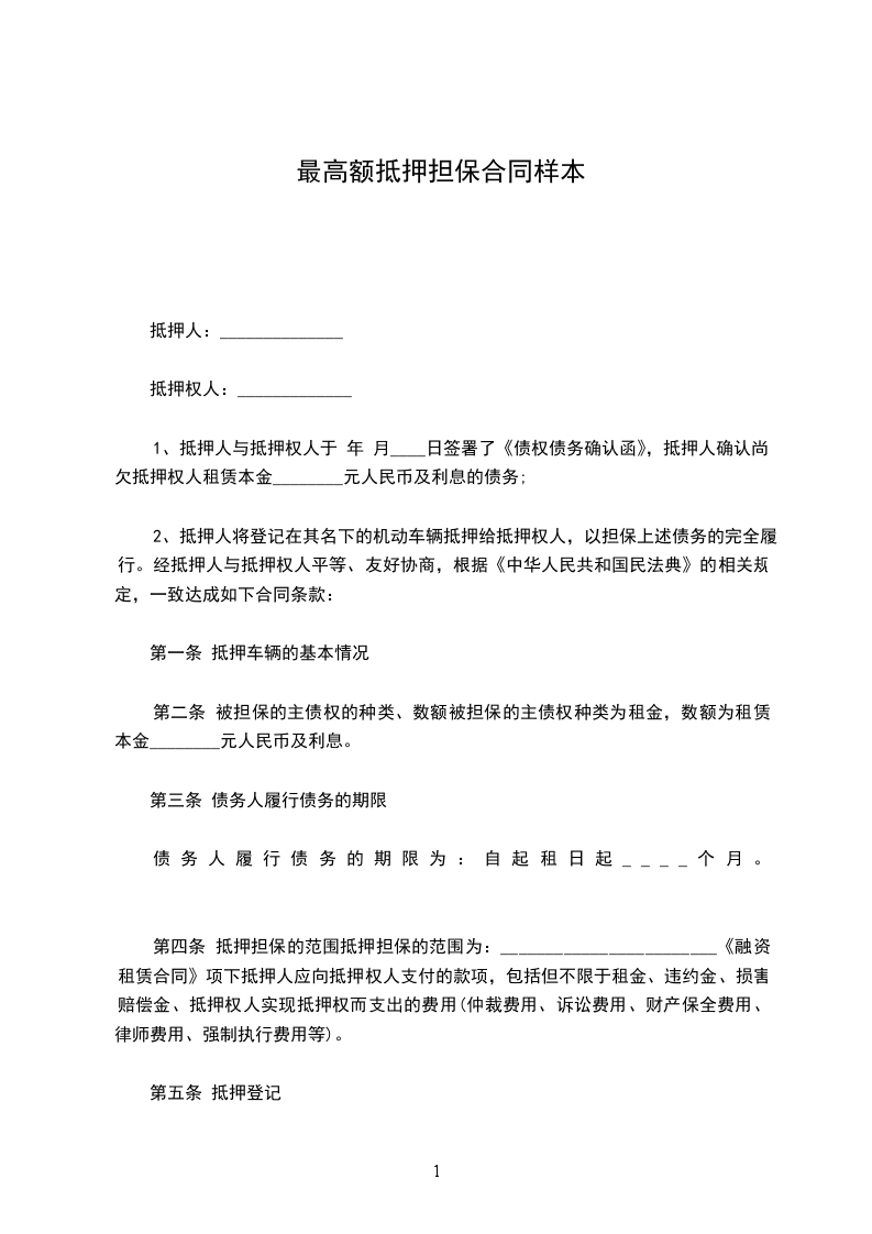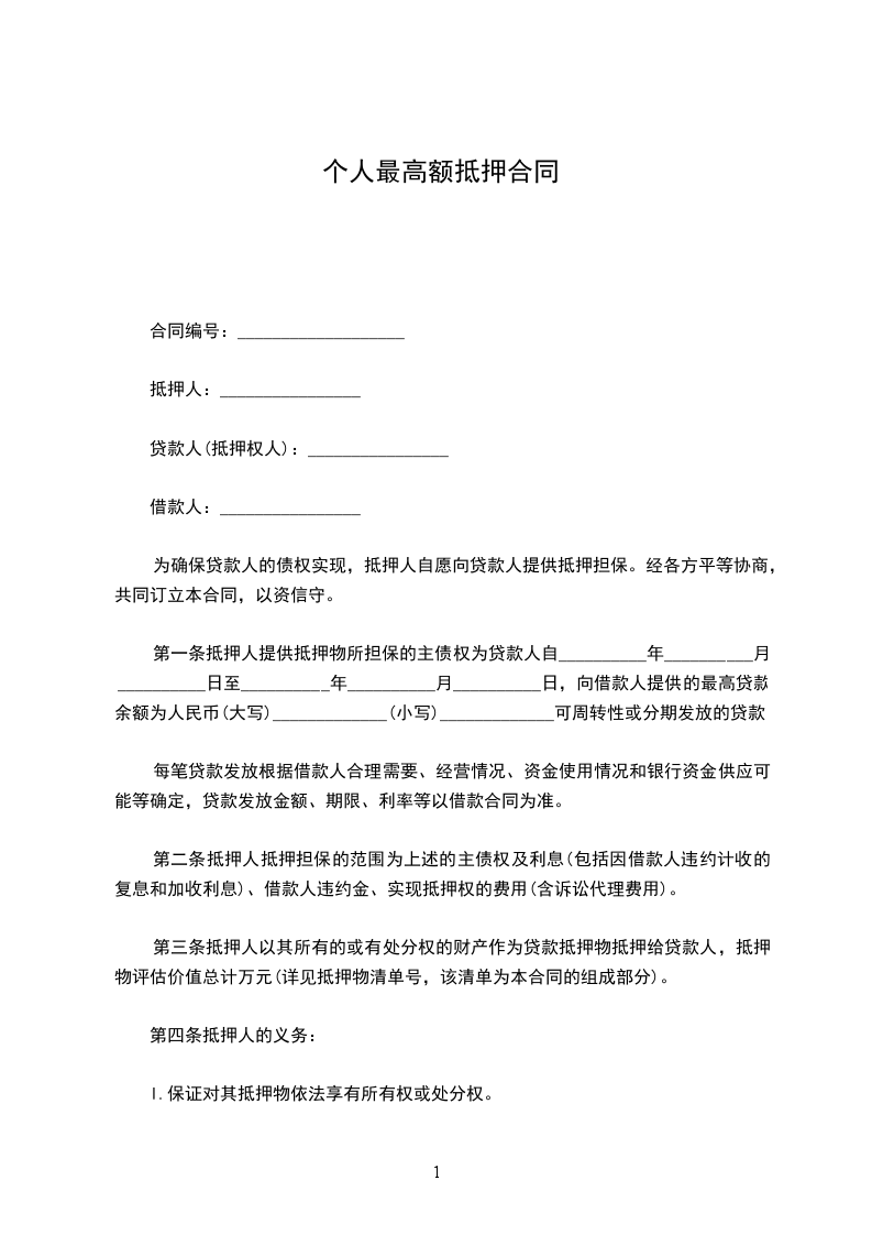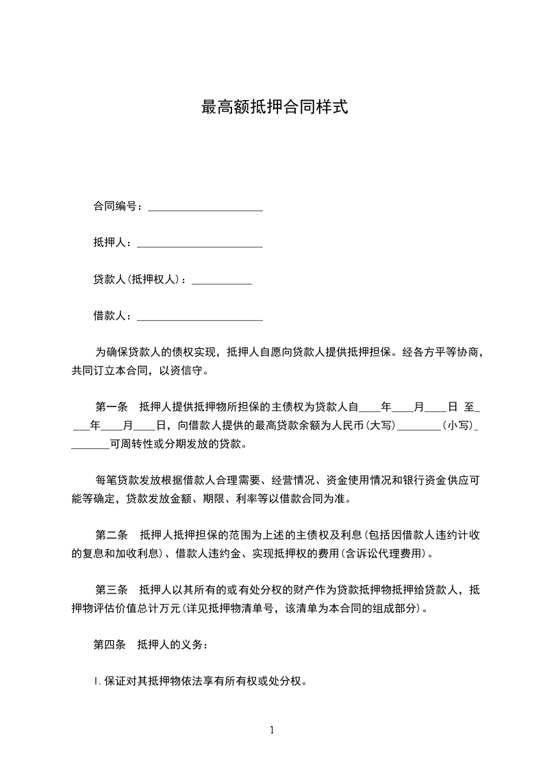 第一条 抵押人提供抵押物所担保的主债权为贷款人自____年____月____日 至____年____月____日,向借款人提供的最高贷款余额为人民币(大写)________(小写)________可周转性或分期发放的贷款。