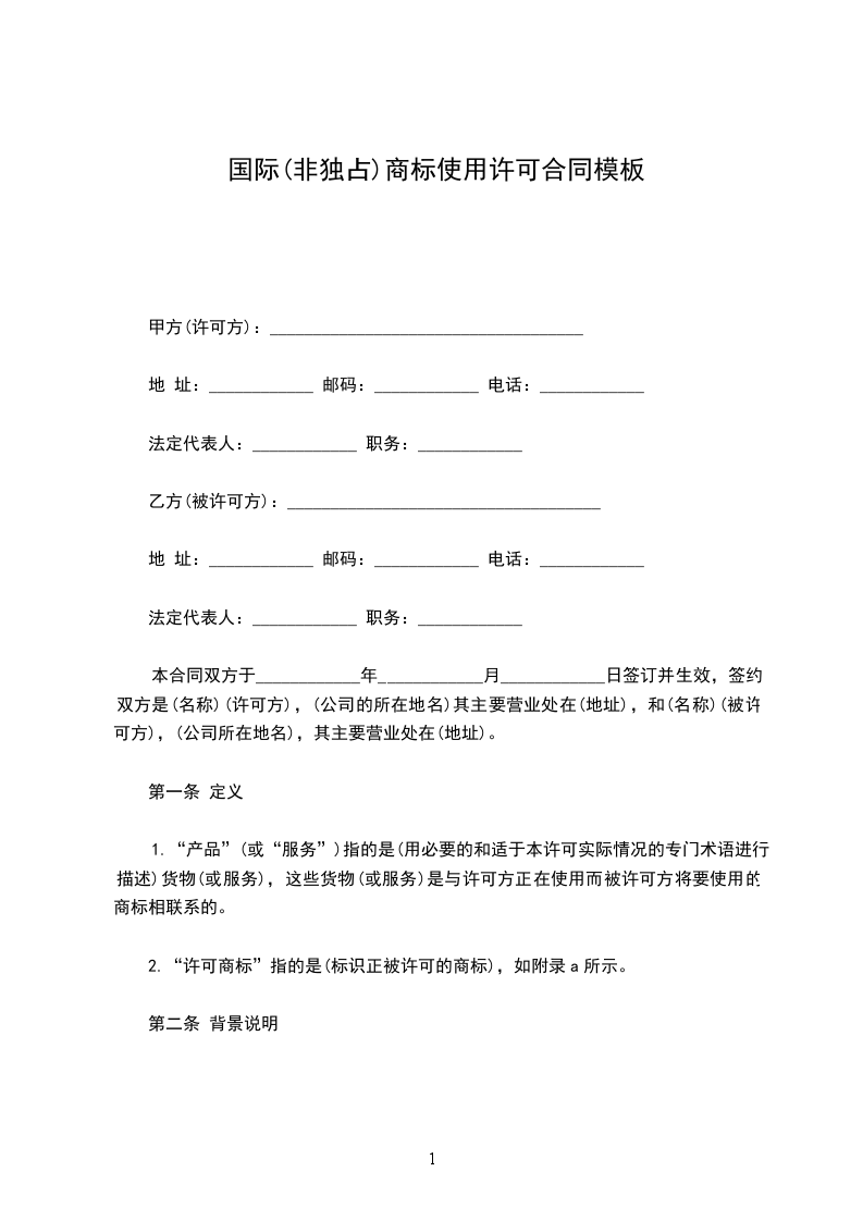 1.“产品”(或“服务”)指的是(用必要的和适于本许可实际情况的专门术语进行描述)货物(或服务),这些货物(或服务)是与许可方正在使用而被许可方将要使用的商标相联系的。