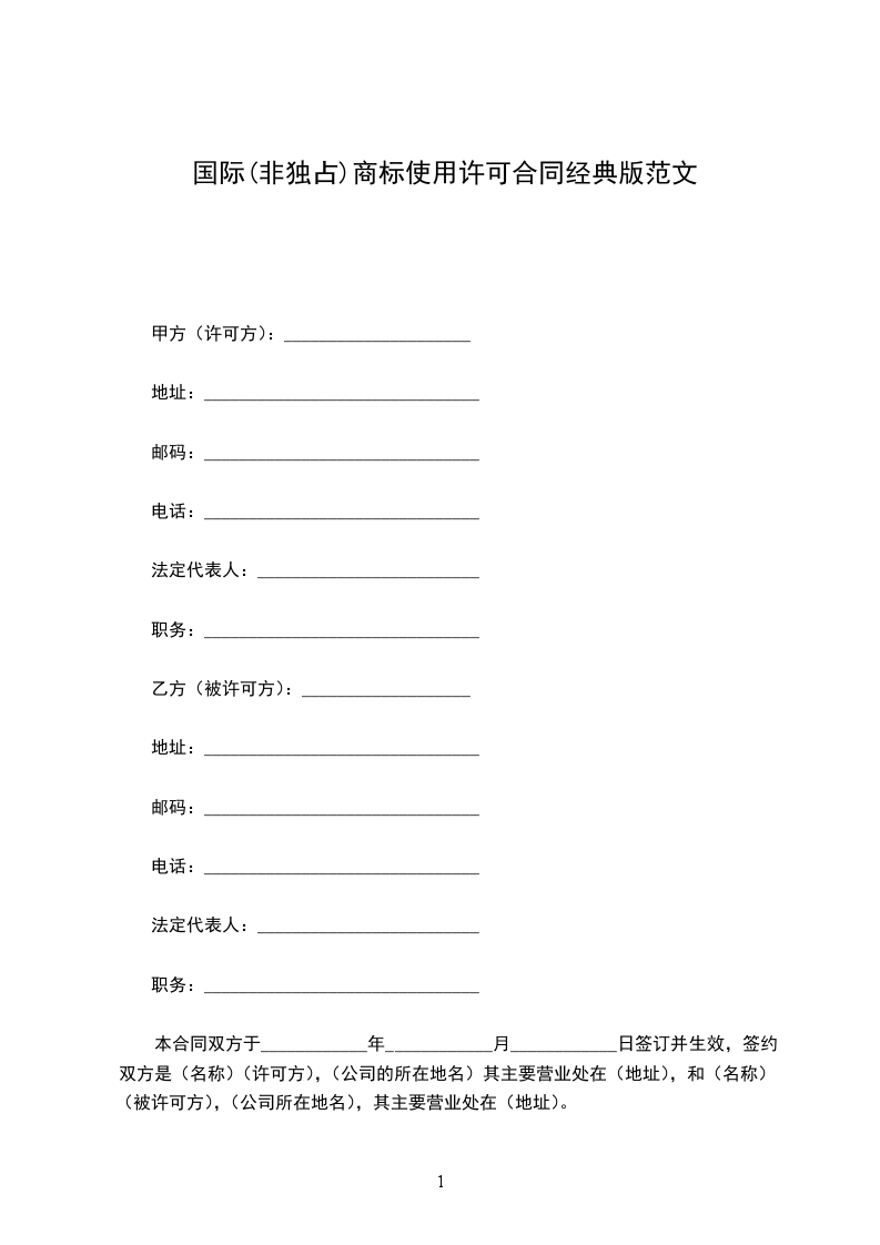 本合同双方于____________年____________月____________日签订并生效,签约双方是(名称)(许可方),(公司的所在地名)其主要营业处在(地址),和(名称)(被许可方),(公司所在地名),其主要营业处在(地址)。