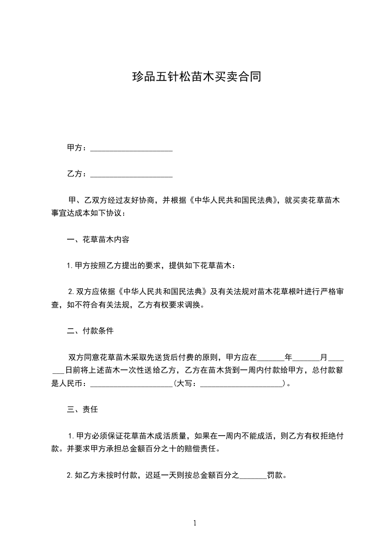 一、根据乙方的需要,甲方组织保质保量的货源,由乙方在场地内自由选购发育正常的树苗,达到乙方满意。乙方购买______________(______________)株,______________(______________)株。(_____________________每株______________元,______________每株______________元)树苗共计_____________________元整。