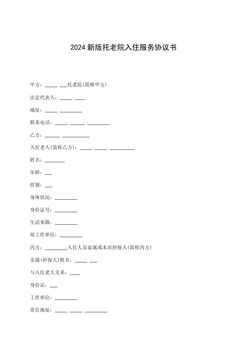 为解决日常生活起居和护理上的困难以安度晚______年,乙方及丙方特委托甲方给予托老院入院护理和服务。现甲方同意乙方入住磐石市夕阳红托老院,为明确三方的权利和义务,互相配合,经三方自愿协商,特订立如下条款,共同遵守。