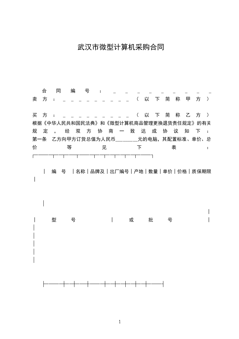 第一条 乙方向甲方订货总值为人民币_________元的电脑,其配置标准、单价、总价等见下表: