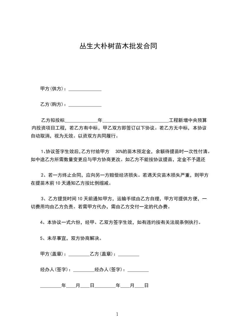 1、协议签字生效后,乙方付给甲方30%的苗木预定金,余额待提苗时一次性付清。如中途乙方所需数量变更应与甲方协商更改。如乙方不能按协议提苗,定金不予退还。