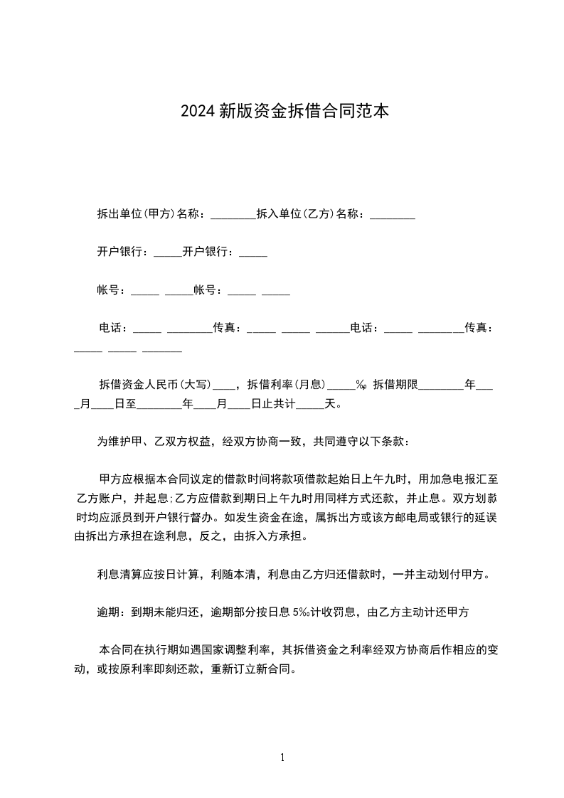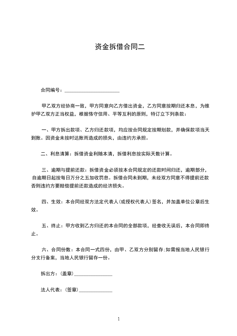 一、甲方拆出款项、乙方归还款项,均应按合同规定按期划款,并确保款项当天到账。因资金未按时达账而造成的损失,由违约方承担。